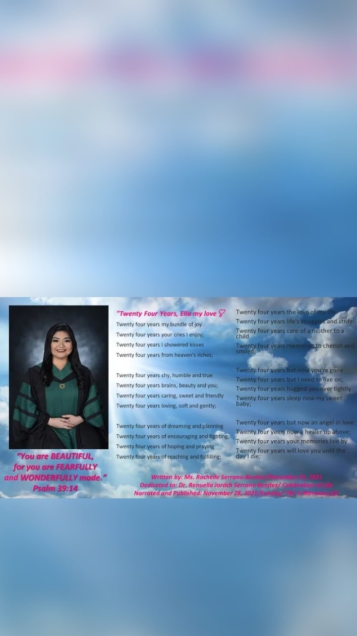 “Twenty Four Years, Ella my love” Posted byEllechorFebruary 5, 2022February 5, 2022Posted inUncategorizedTags:Daughter, Dedication, Eulogy, Love for a daughter, Poem, SLE “Twenty Four Years, Ella my love” Share this: Click to share on X (Opens in new window) X Click to share on Facebook (Opens in new window) Facebook Like Loading... Related Published by Ellechor Hey there! I am a mother of two and I love writing poems, watching Netflix, singing and reading fictional books. View more posts